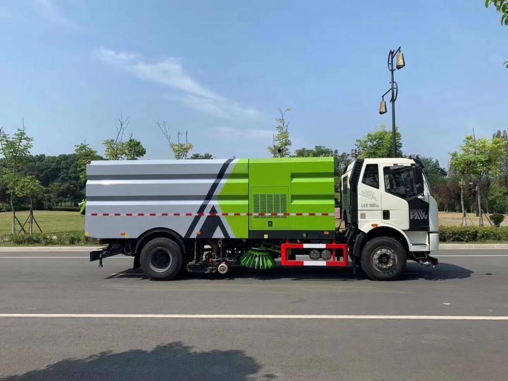 高效洗掃車利用高壓水流及傾斜掃刷將垃圾掃**吸盤前面,在風機產生的負壓作業下,風流在閉合的回路中將垃圾吸入垃圾箱中貯存,整個作業過程均是物理原理,不會產生化學廢料或垃圾外泄對環境的二次污染,同時,后噴霧的降塵有效的降低了空氣中粉塵濃度,解決粉塵污染問題。