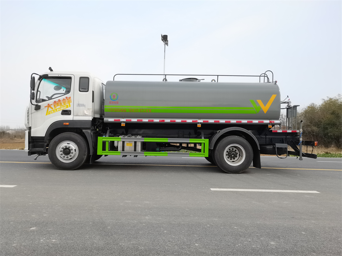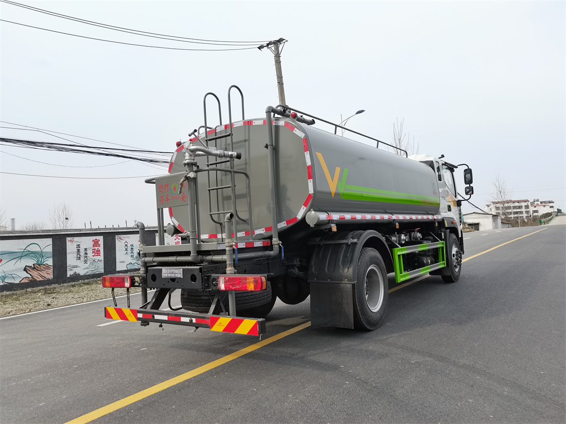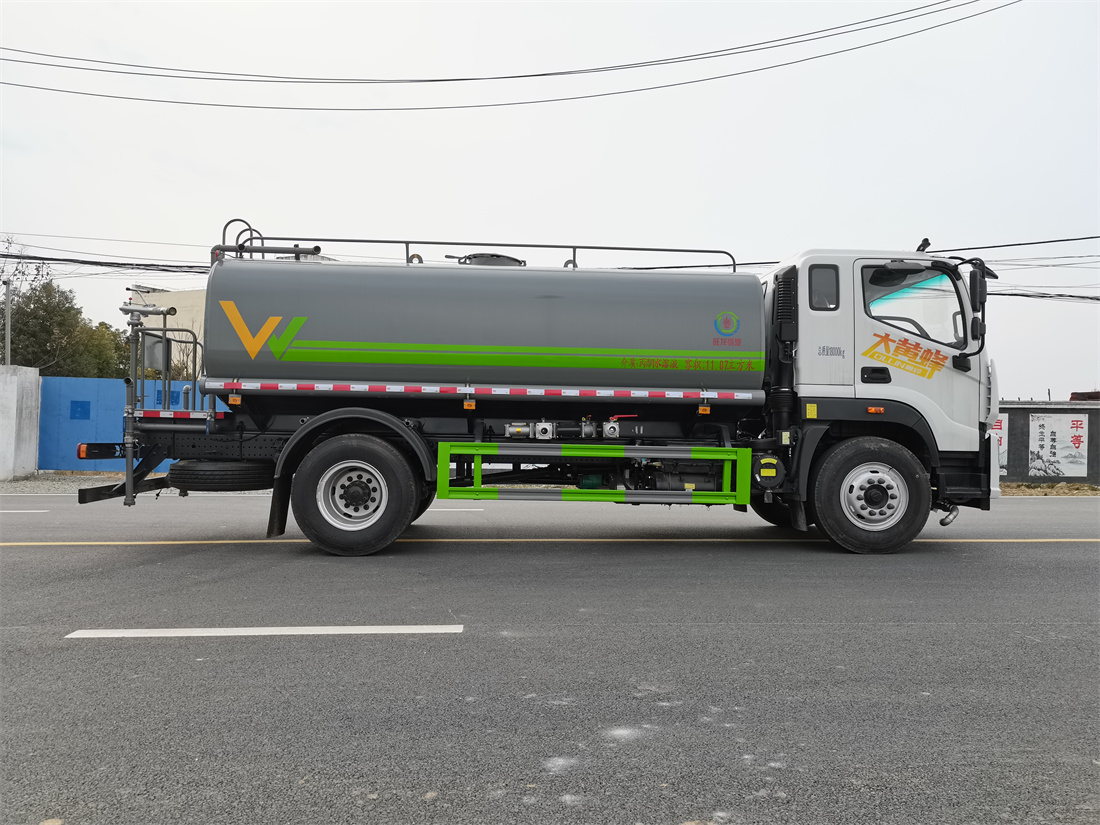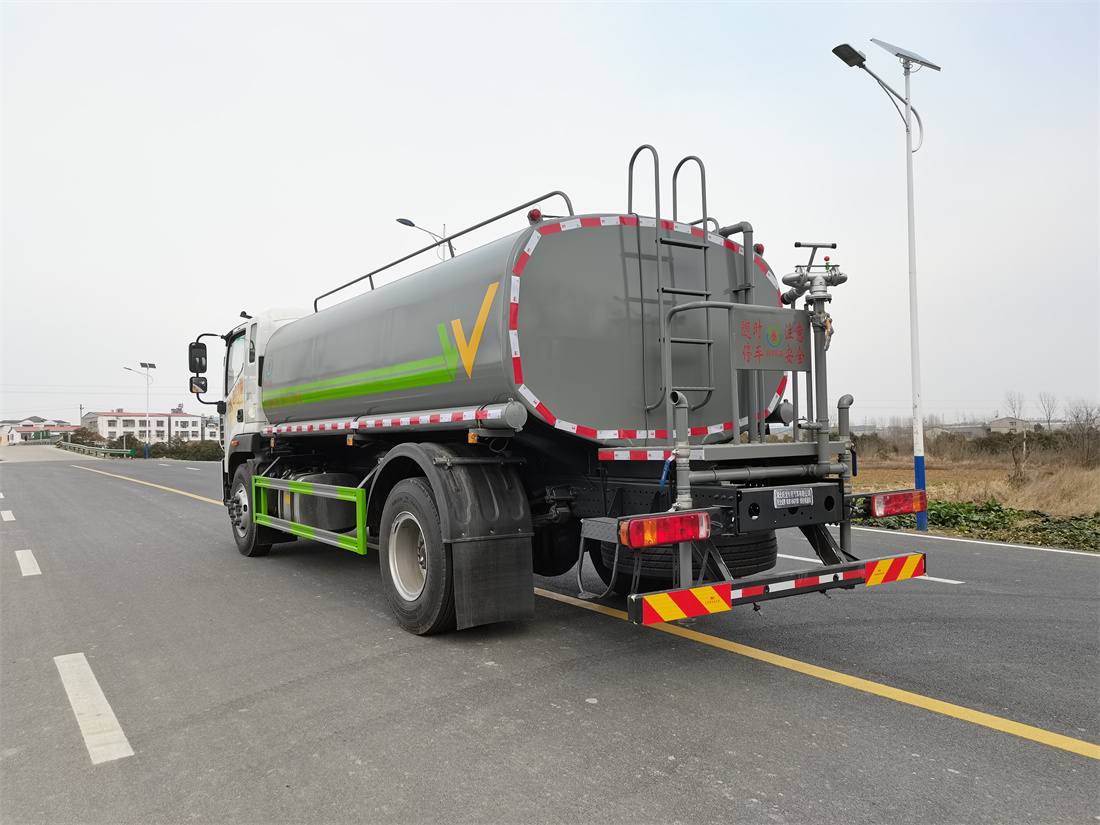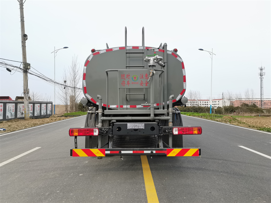 灑水車前裝有鴨形噴嘴或圓頭沖嘴,后面裝有圓柱開(kāi)灑水噴嘴或蓮蓬頭噴嘴,后部有一工作平臺(tái),裝配有水炮。后部還可裝8個(gè)噴嘴(選裝)。
